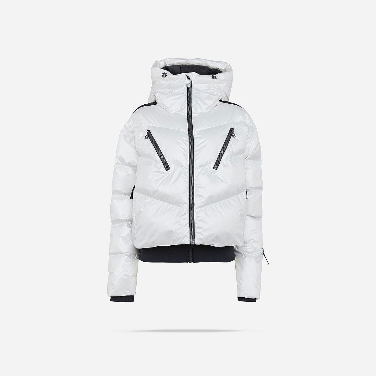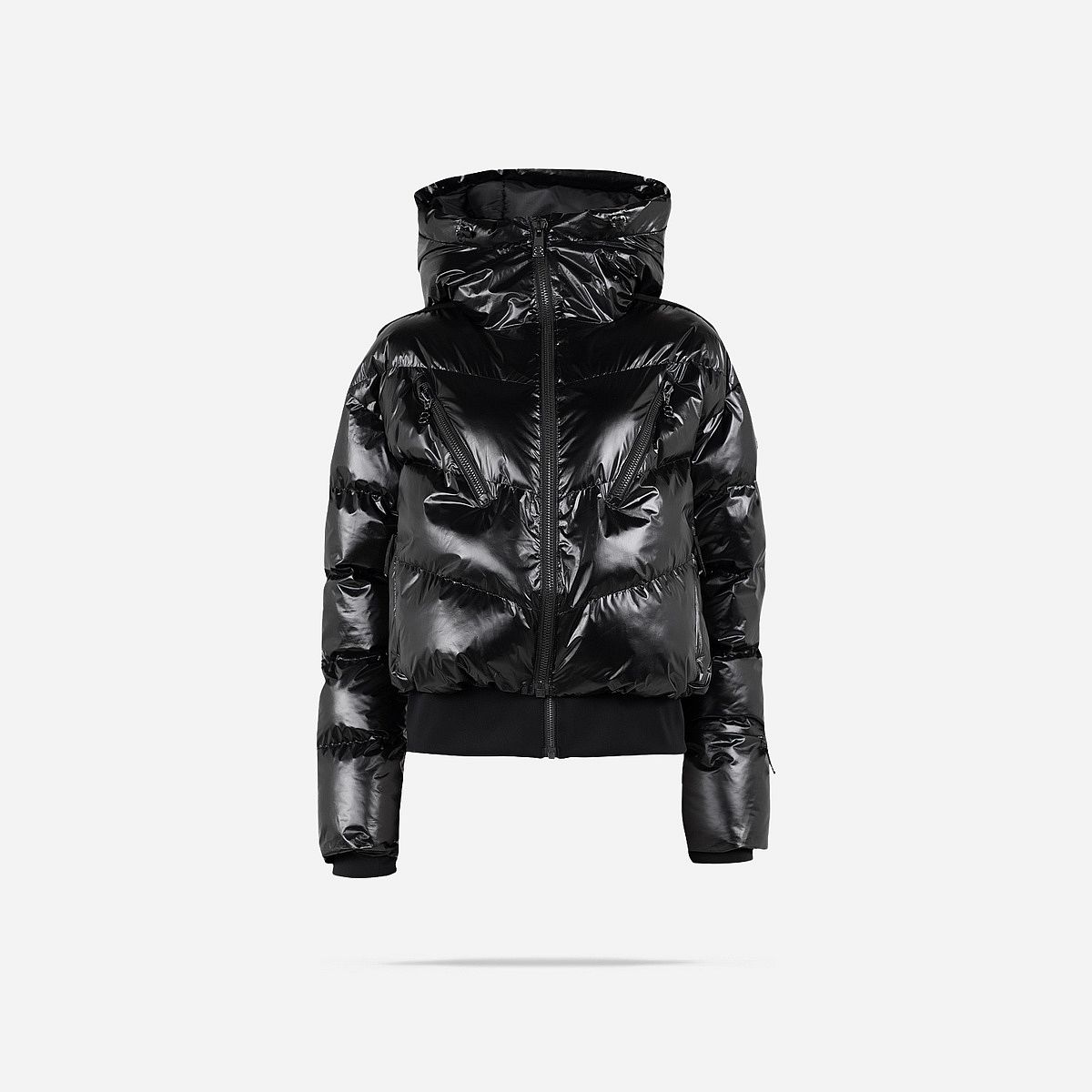 - Model: Boxy puffer met glanzende afwerking en donsvulling.