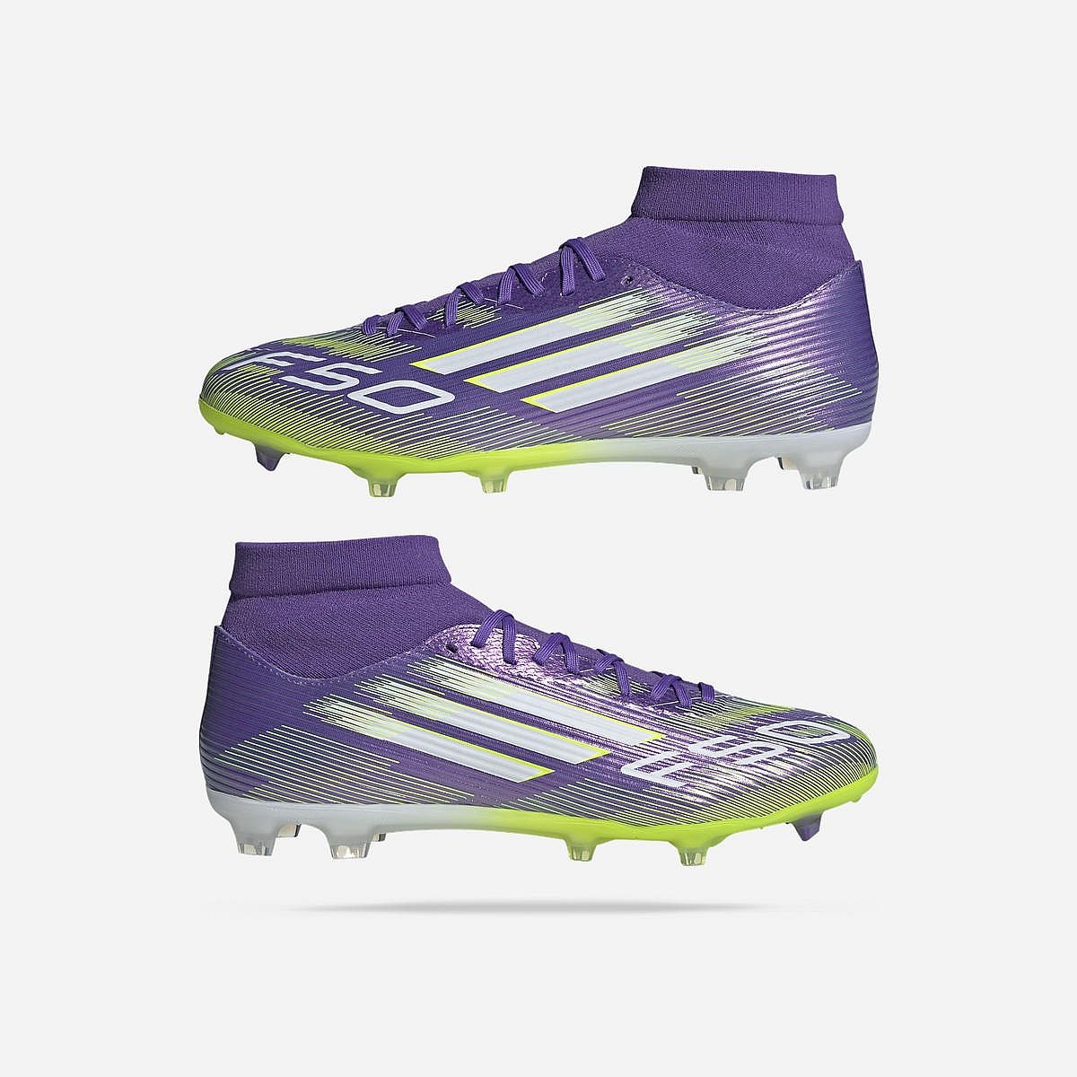 De F50 League Mid Gras/Kunstgras Voetbalschoenen voor senioren van Adidas zijn ontworpen voor de serieuze voetballer die snelheid en veelzijdigheid zoekt. Deze mid-cut schoenen bieden optimale ondersteuning en grip, waardoor je je spel naar een hoger niveau kunt tillen, ongeacht het veldtype. Met een opvallende paarse kleurstijl zijn ze niet alleen functioneel, maar ook modieus.