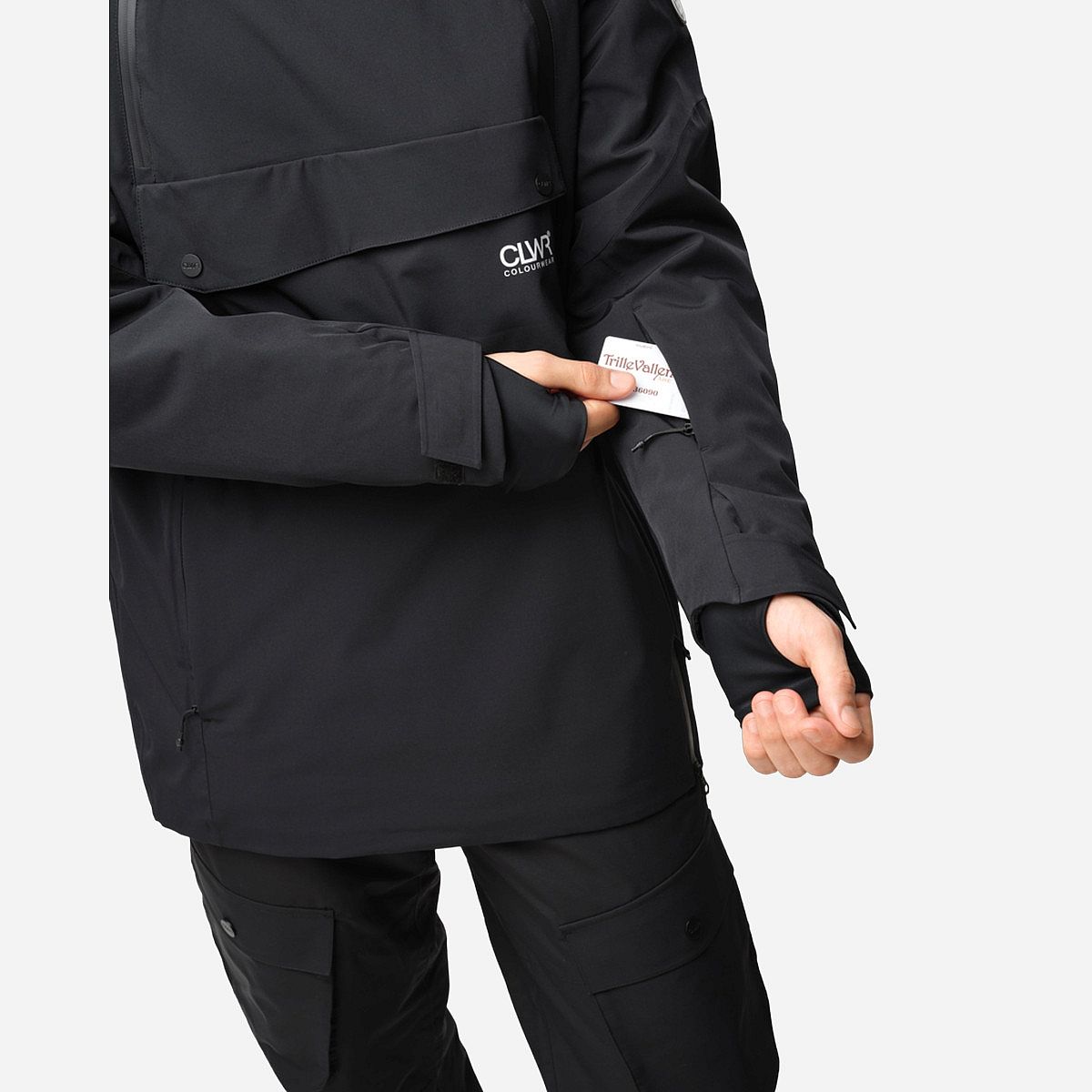 - De jas heeft een buidelzak met drukknoop, twee ritszakken en een speciaal zakje op de mouw voor je skipas.