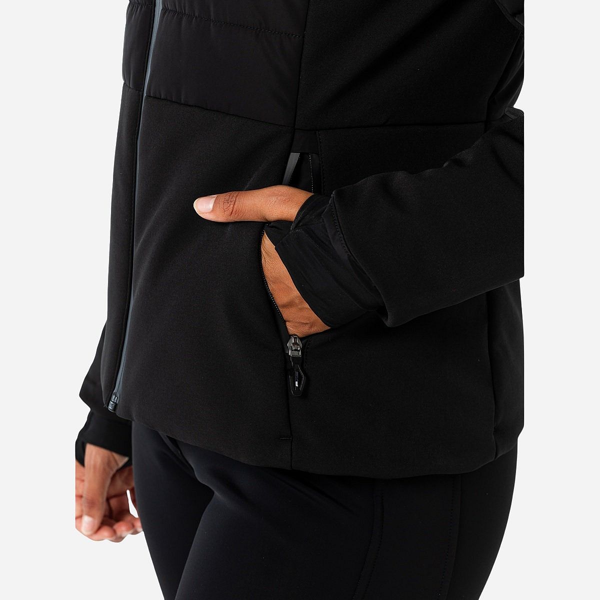 - Materiaal: Hybride jas met 94% polyester en 6% elastaan