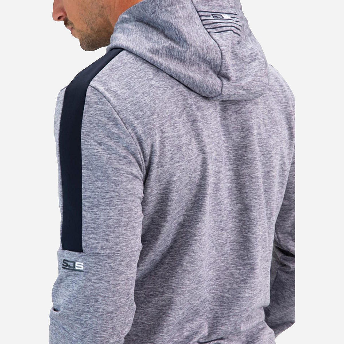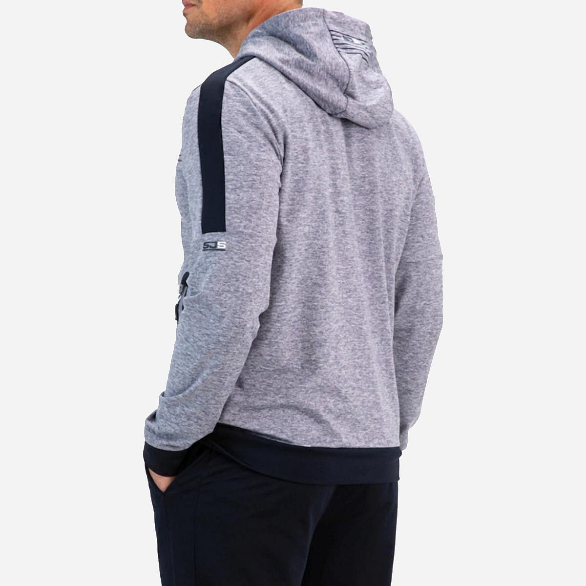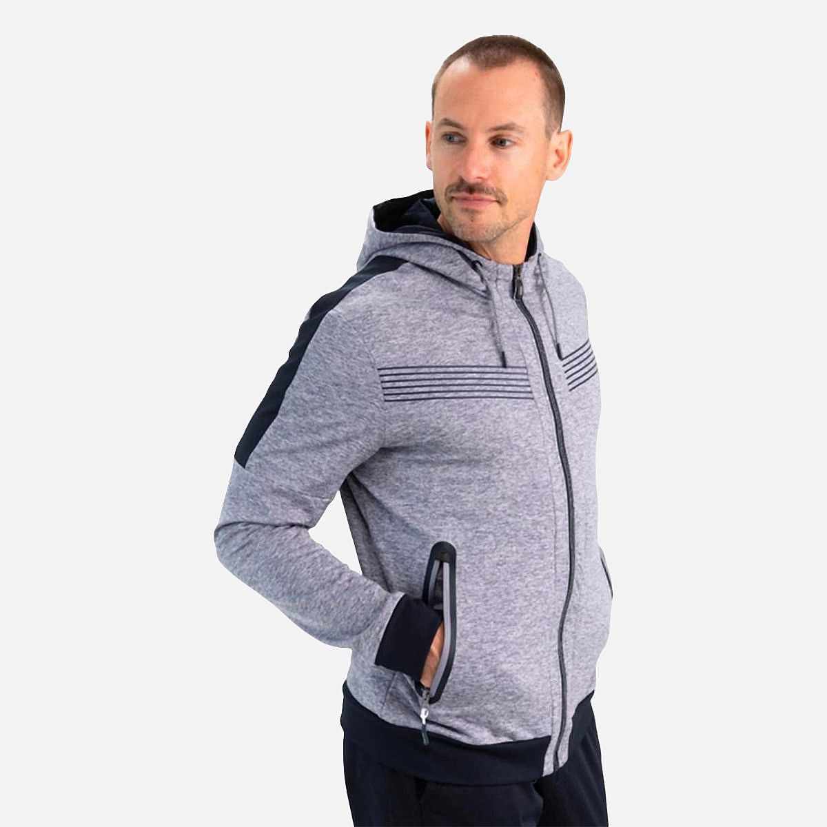Dit comfortabele hooded heren vest is vervaardigd uit grijs gemeleerde powerstretch, perfect voor een actieve levensstijl. De veelzijdige donkerblauwe details geven het vest een stijlvolle uitstraling. Dankzij de dubbele laag stof in de capuchon blijf je heerlijk warm, terwijl de geprinte siliconen strepen een sportieve touch toevoegen. Het vest is bovendien uitgerust met zakken met ritssluiting, afgewerkt met seal-on tape voor extra bescherming.