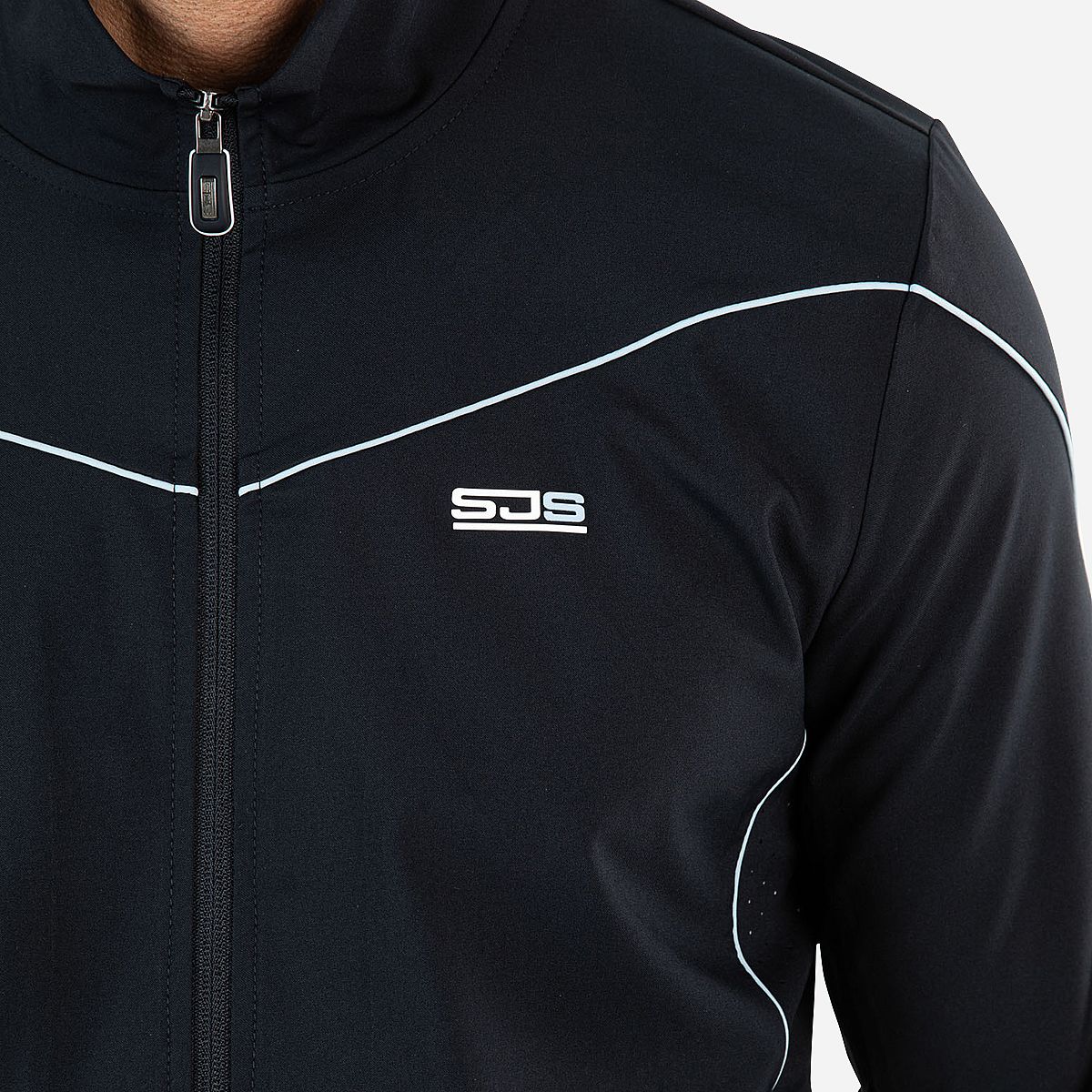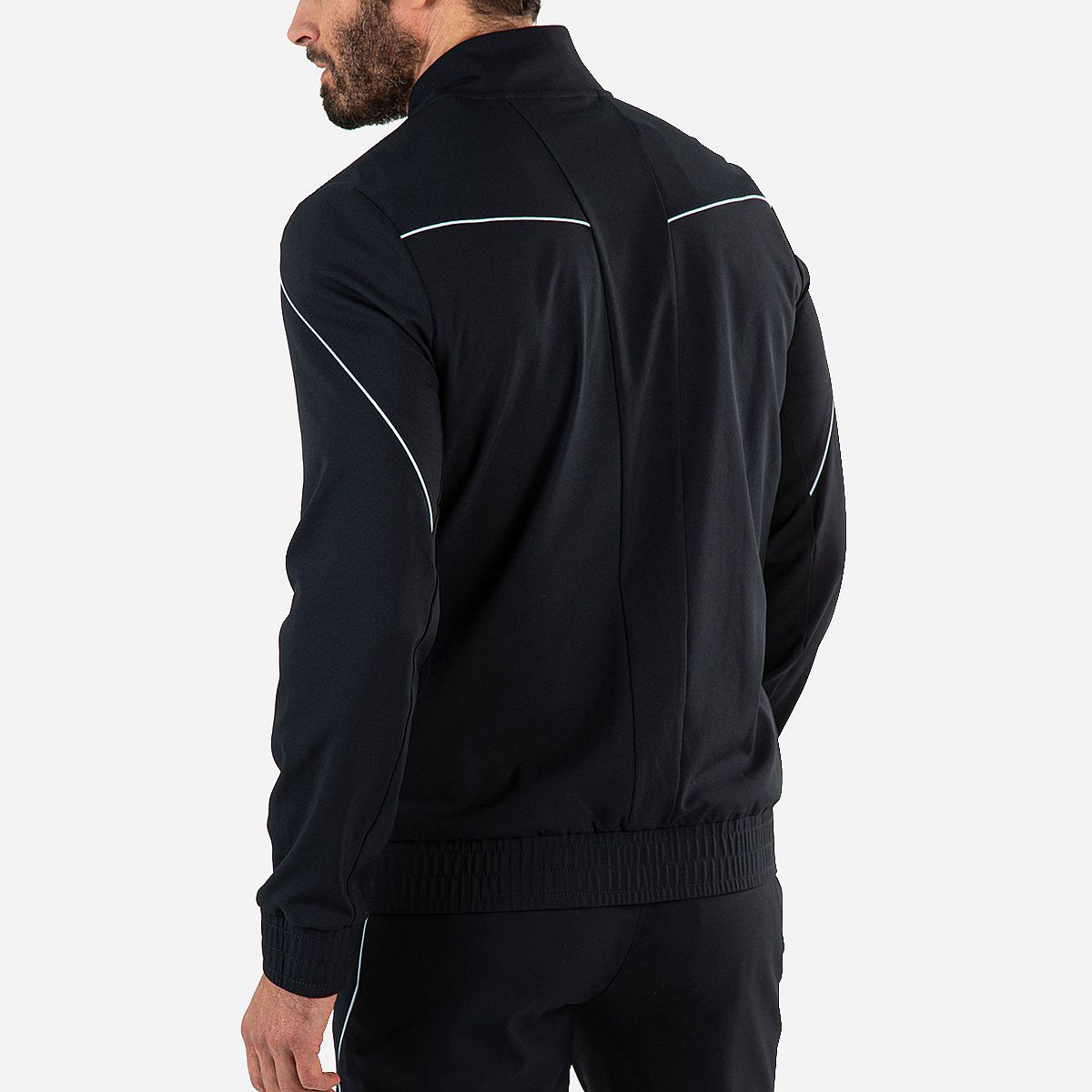 - Gecoate ritssluiting en smalle lichtblauwe pipings voor een sportieve uitstraling