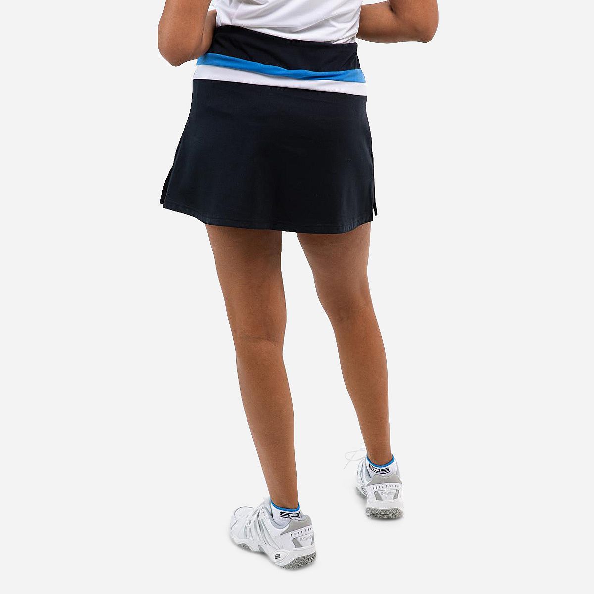 Maak kennis met ons donkere tennisrokje, gemaakt van geweven horizontale stretch en voorzien van een comfortabel binnenbroekje van jersey stretch. Dit rokje heeft een elastische tailleband van stevige jersey, versierd met contrasterende kleurenspeten, en beschikt aan de zijkanten over handige splitten voor extra bewegingsvrijheid.