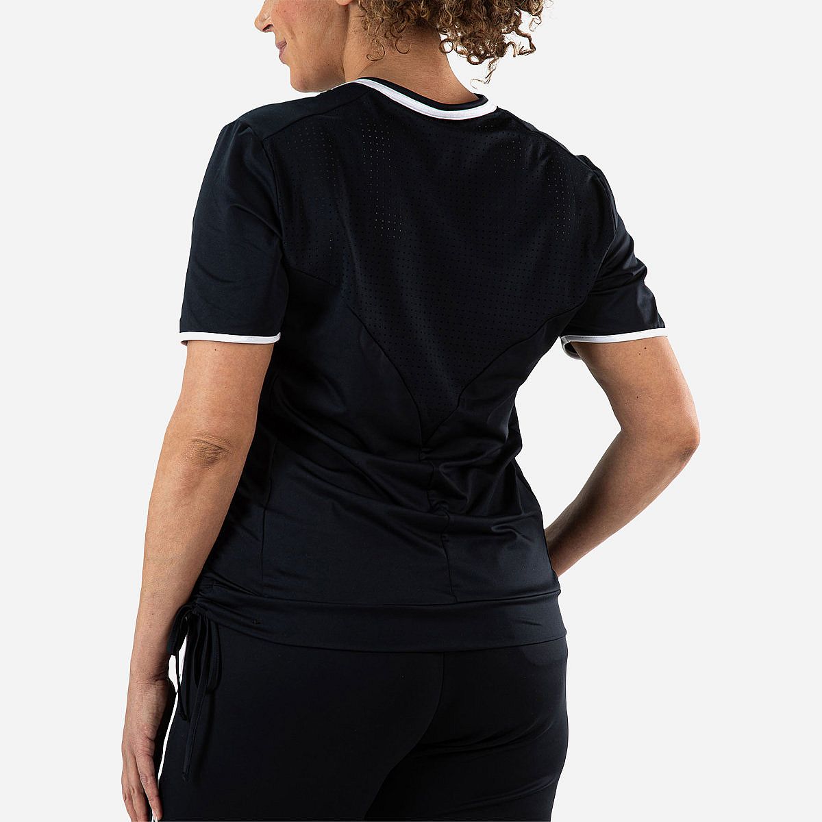Maak kennis met het Iluna Plus T-Shirt van Sjeng Sports, een must-have voor elke sportieve dame. Dit donkerblauwe, plus size t-shirt met een stijlvolle v-hals geeft je niet alleen een modieuze uitstraling, maar biedt ook comfort tijdens je workouts. De geperforeerde inzet op de rug zorgt voor een optimale ventilatie, zodat je altijd fris blijft, zelfs bij de meest intense trainingen.