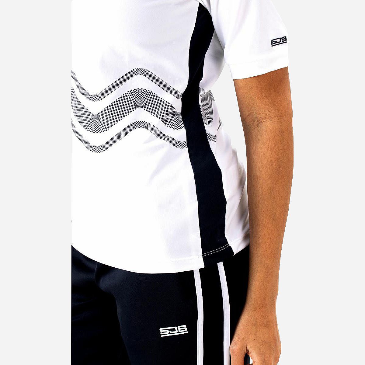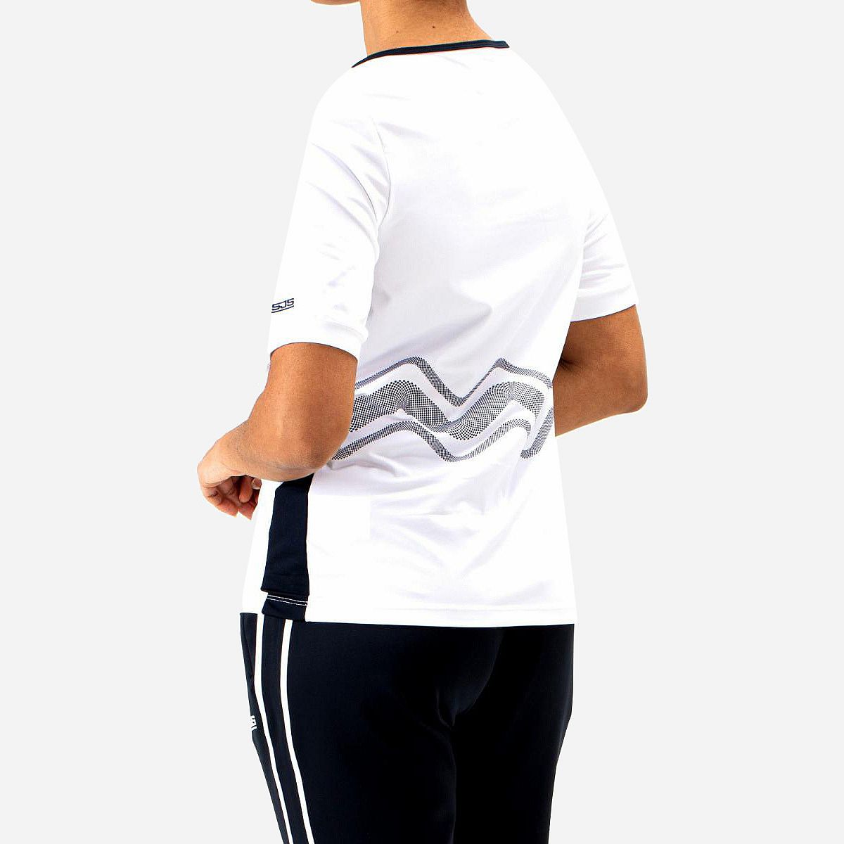 Dit luchtige dames t-shirt van witte single jersey is een must-have voor je zomeroutfit. Het vrolijke golfpatroon dat over de voorkant en rug loopt, geeft het een speelse uitstraling. Met iets langere mouwen dan gebruikelijk, biedt dit shirt niet alleen comfort maar ook een modieuze look. Perfect te combineren met ons trainingsjack Fenne, dat dezelfde print heeft!