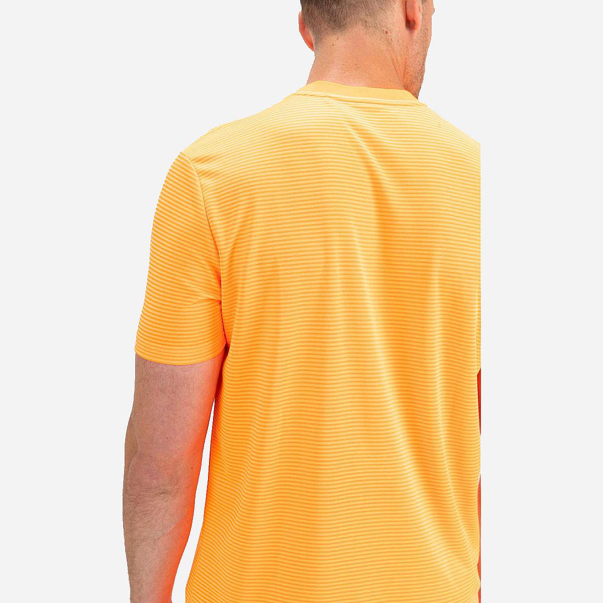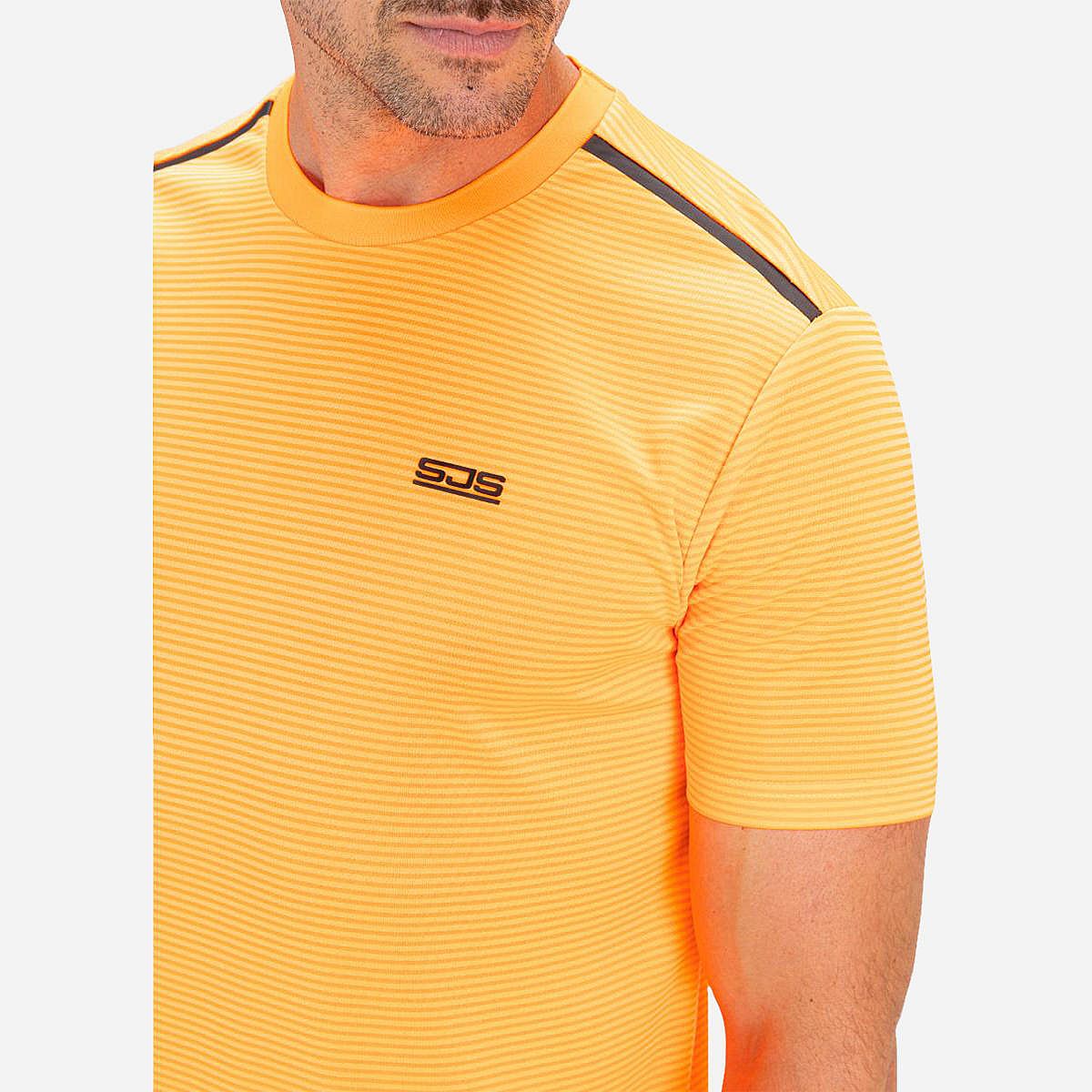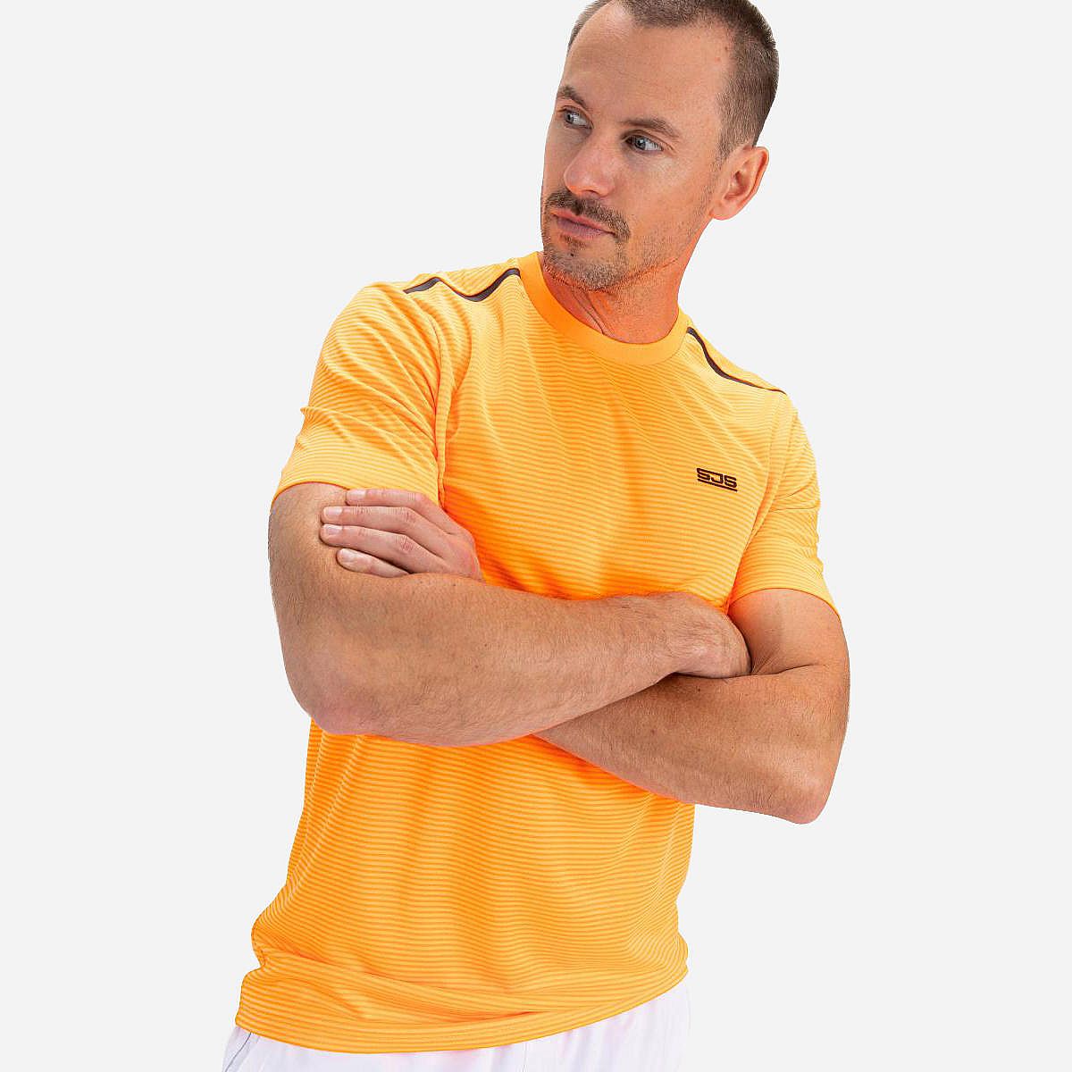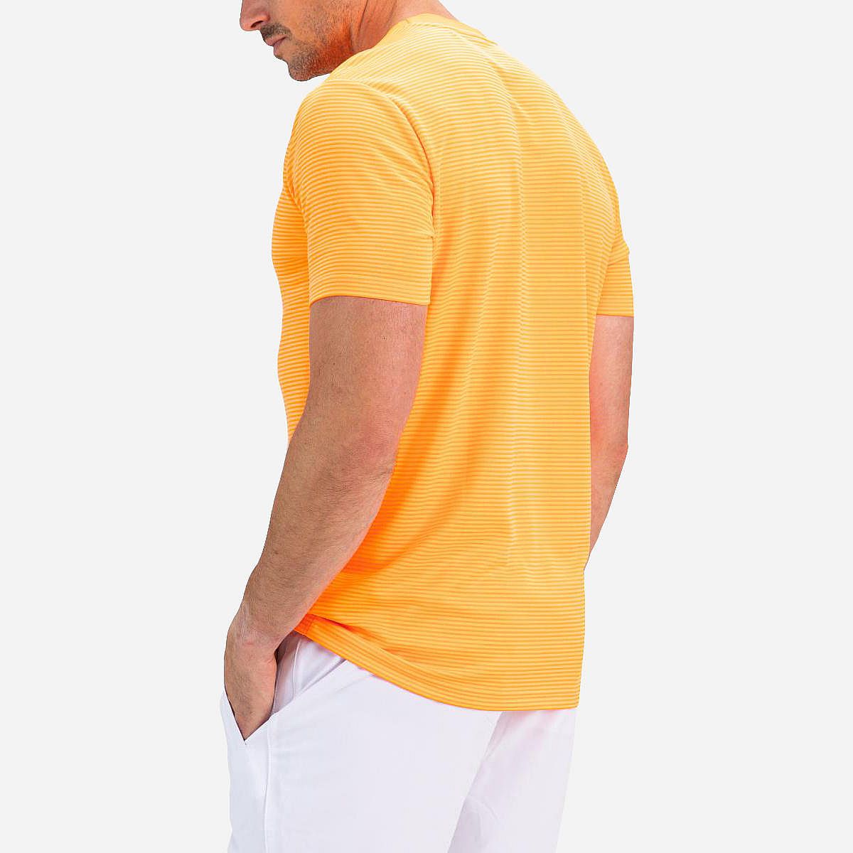 Dit heren t-shirt in de trendy kleur oranje clown fish heeft een subtiel patroon van horizontale strepen. Gemaakt van comfortabele pique stof, biedt dit shirt de kwaliteit die je van poloshirts kent. Het is een sportief en veelzijdig basic shirt dat perfect is voor elk seizoen.