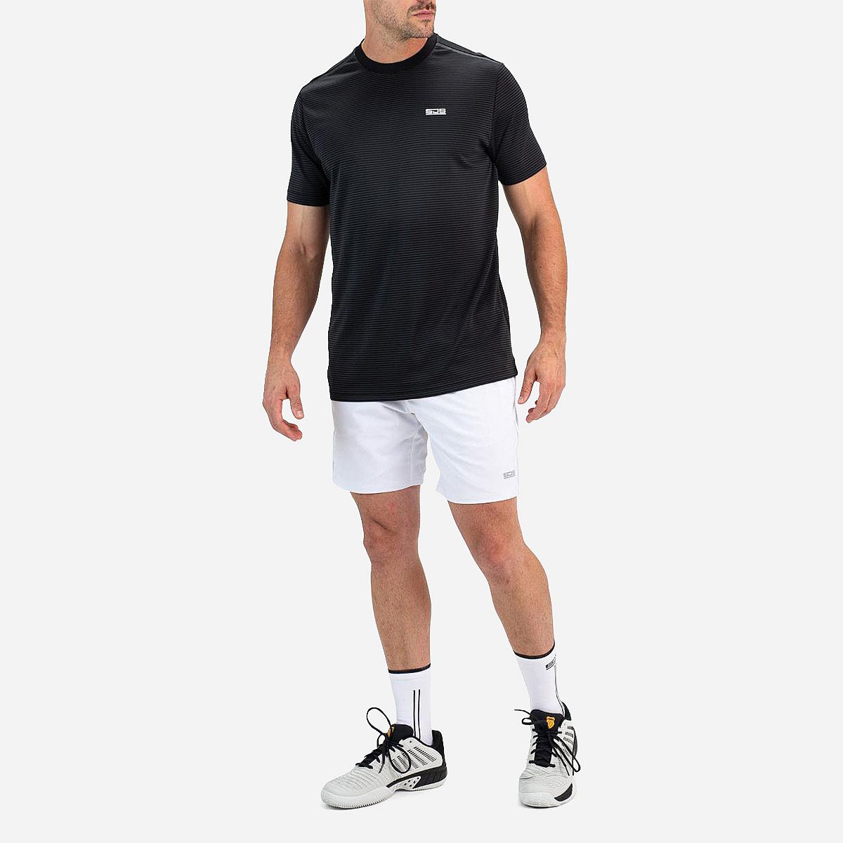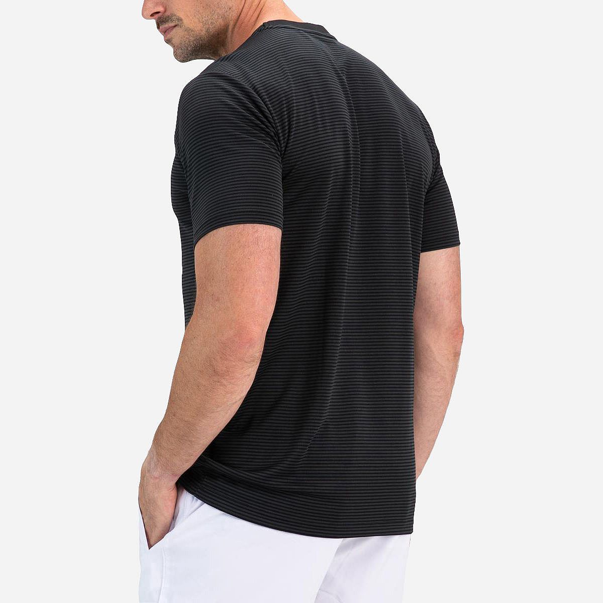 Dit zwarte heren t-shirt met een subtiele horizontale streep is een echte aanwinst voor je garderobe. Het is vervaardigd uit soepel pique-materiaal, dat bekend staat om zijn comfortabele feel en ademend vermogen. Dit sportieve basisitem is perfect voor elk seizoen en zorgt ervoor dat je er altijd stijlvol uitziet.