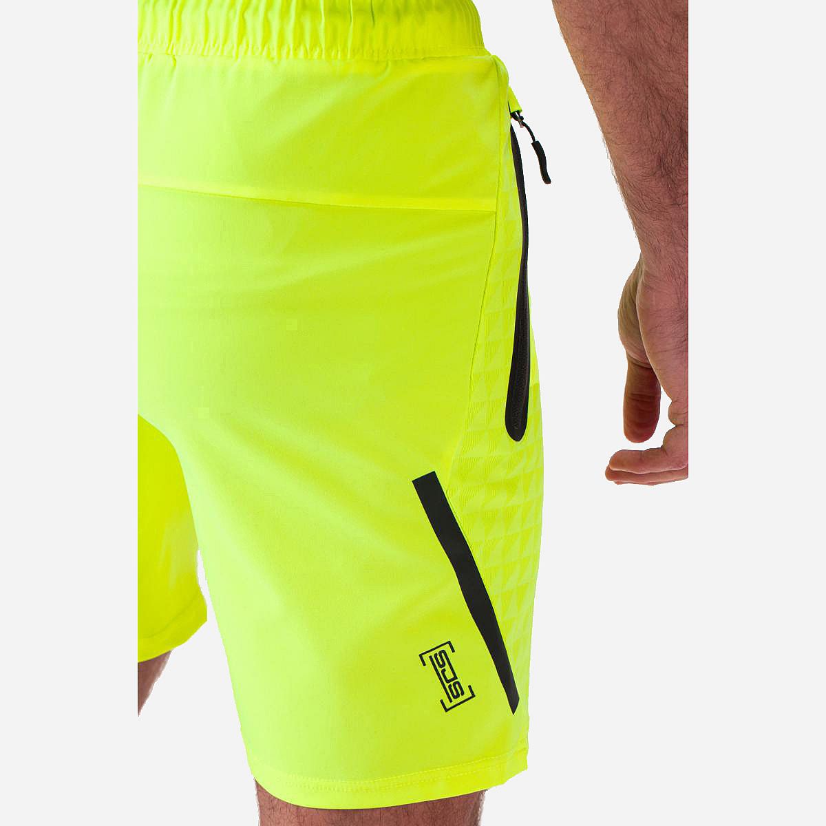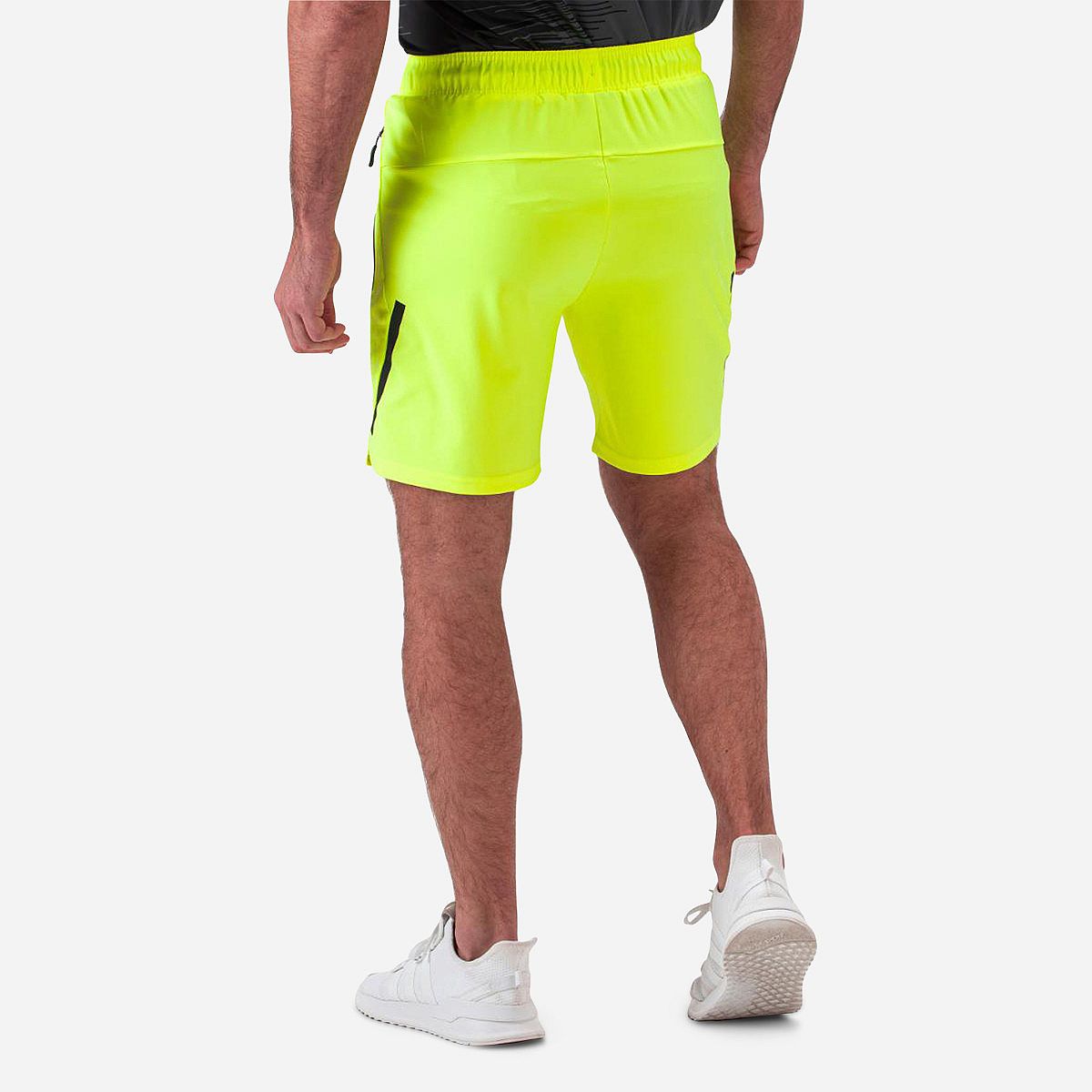 Deze heren short in de frisse kleur acid yellow is gemaakt van horizontaal geweven stretchmateriaal en beschikt over een stijlvolle print aan de voorkant. Perfect voor zonnige dagen, biedt deze short niet alleen comfort, maar ook praktische functies zoals gesealde zakken en gesealde inzetten aan de zijkanten.